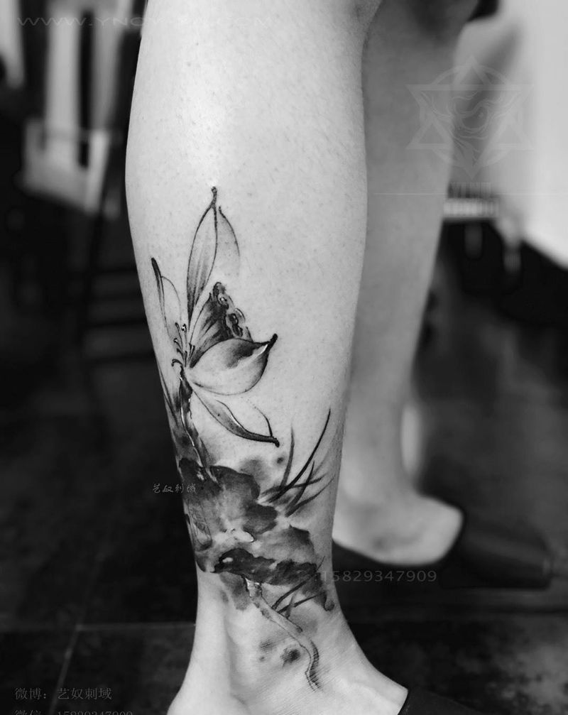 和尚老师原创 水墨莲花 遮盖小字母纹身图片_成品艺奴刺域原创国画植物腿部纹身图案