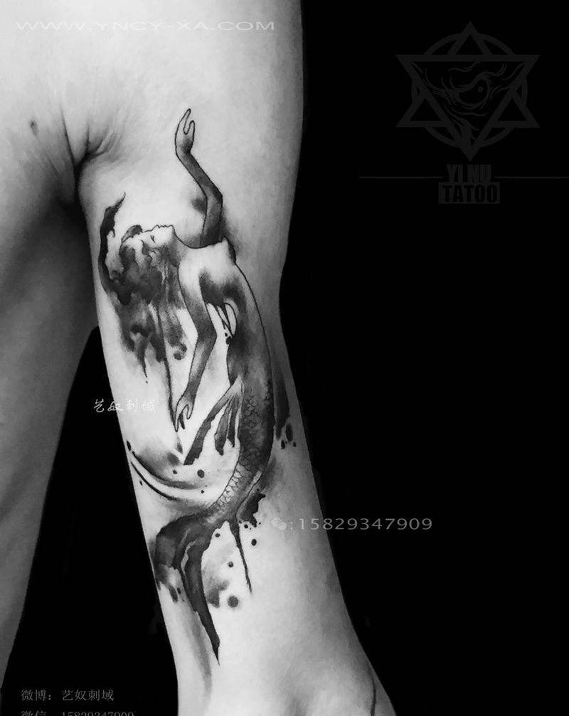 当前位置: 首页 >陕西省西安市纹身店-艺奴刺域纹身图案>水墨美人鱼纹身图片_成品艺奴刺域人物国画清新手臂纹身图案