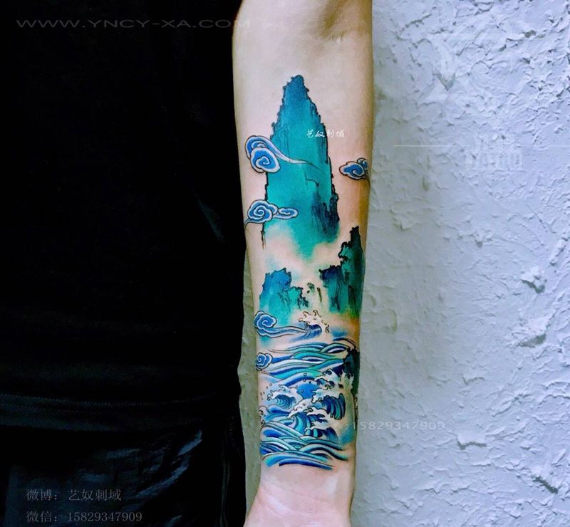 当前位置: 首页 >陕西省西安市纹身店-艺奴刺域纹身图案>师傅原创青山臂纹身图片_成品艺奴刺域原创清新手臂纹身图案