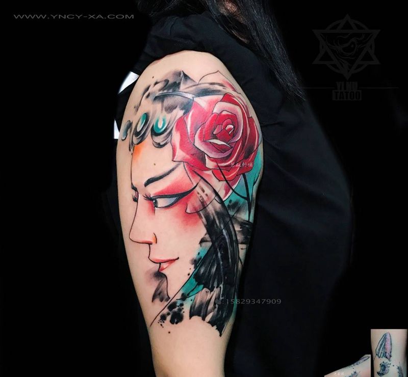 当前位置: 首页 >陕西省西安市纹身店-艺奴刺域纹身图案>原创遮盖花旦疤痕纹身图片_成品中国风艺奴刺域水墨画人物原创手臂纹身图案