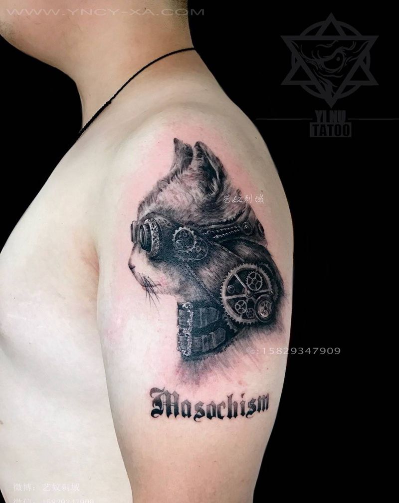 蒸汽朋克猫纹身图片_成品艺奴刺域动物写实手臂肩部纹身图案
