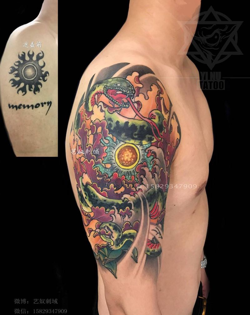和尚老师原创遮盖失败纹身。“蛇盘牡丹”吉祥富贵[呲牙]纹身图片_成品手臂传统动物原创艺奴刺域纹身图案