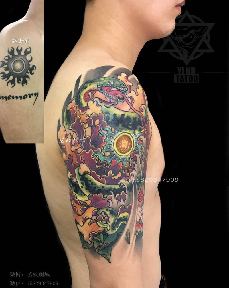 和尚老师原创遮盖失败纹身。“蛇盘牡丹”吉祥富贵[呲牙]纹身图片_成品手臂传统动物原创艺奴刺域纹身图案