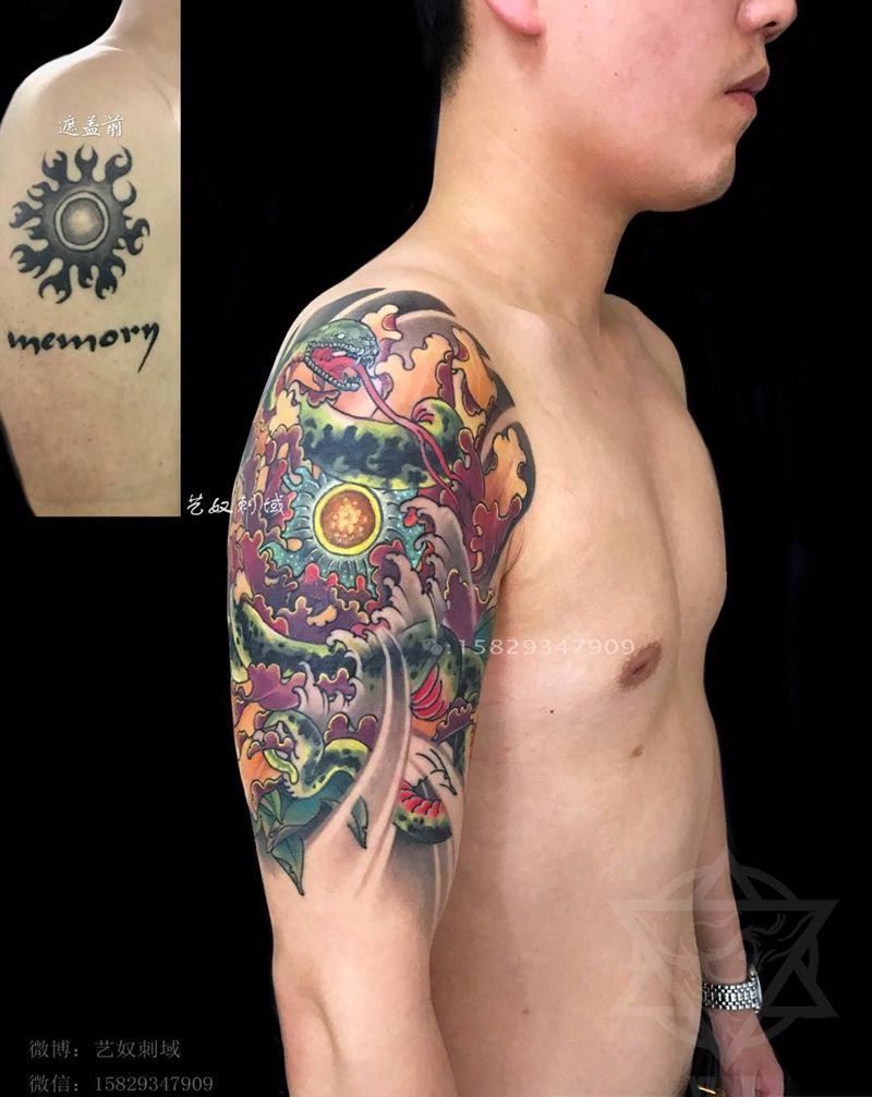 和尚老师原创遮盖失败纹身。“蛇盘牡丹”吉祥富贵[呲牙]纹身图片_成品手臂传统动物原创艺奴刺域纹身图案