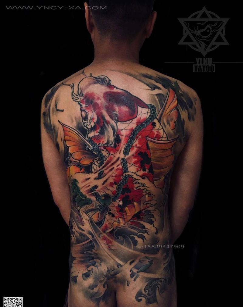 和尚老师原创-富贵的锦鲤鱼儿[愉快]纹身图片_成品艺奴刺域原创动物传统背部纹身图案