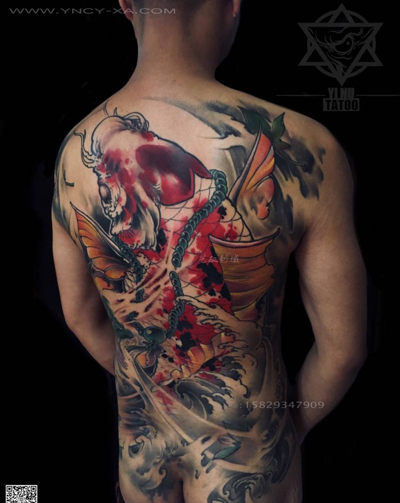 和尚老师原创-富贵的锦鲤鱼儿[愉快]纹身图片_成品艺奴刺域原创动物传统背部纹身图案