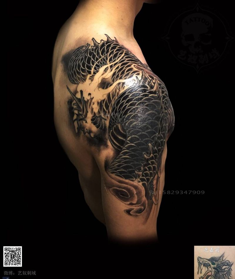 当前位置: 首页 >陕西省西安市纹身店-艺奴刺域纹身图案>和尚老师原创半胛龙遮盖 [呲牙]纹身图片_成品手臂传统动物原创艺奴刺域纹身图案