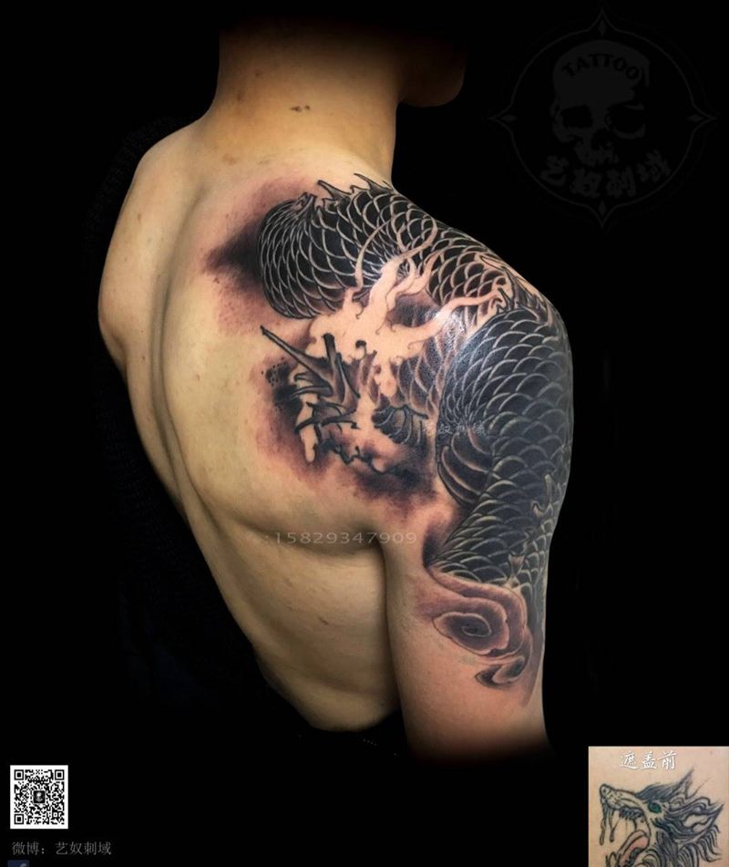 当前位置: 首页 >陕西省西安市纹身店-艺奴刺域纹身图案>和尚老师原创半胛龙遮盖 [呲牙]纹身图片_成品手臂传统动物原创艺奴刺域纹身图案