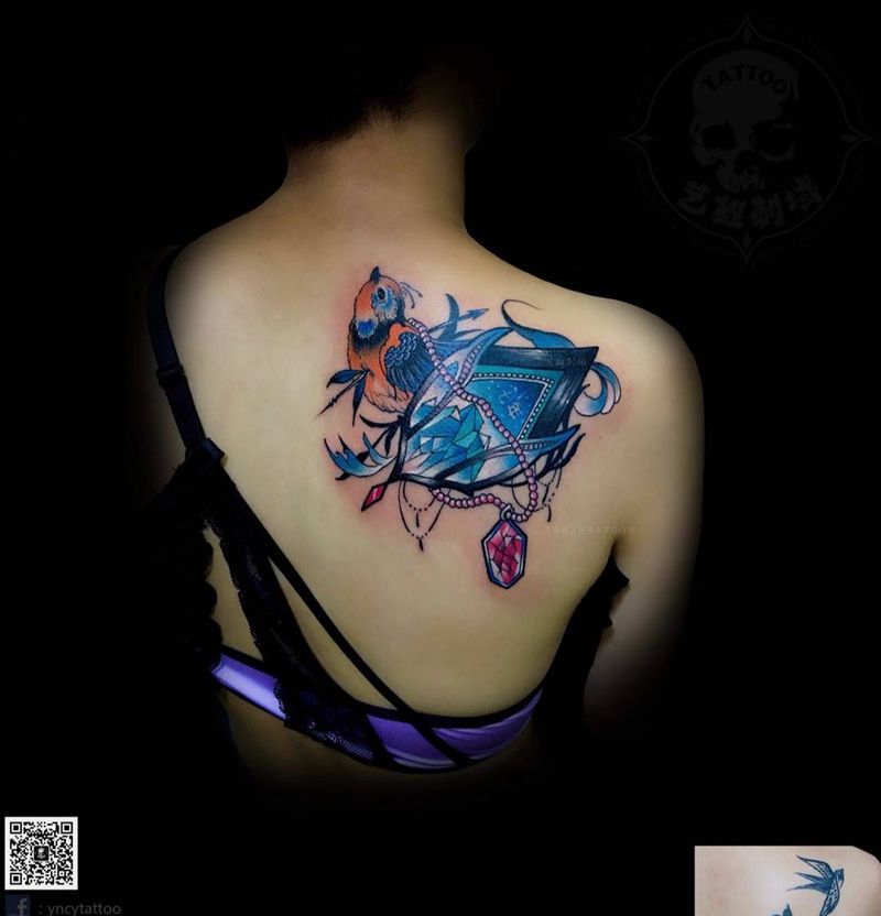原创燕子遮盖纹身图片_成品艺奴刺域原创动物清新背部肩部纹身图案