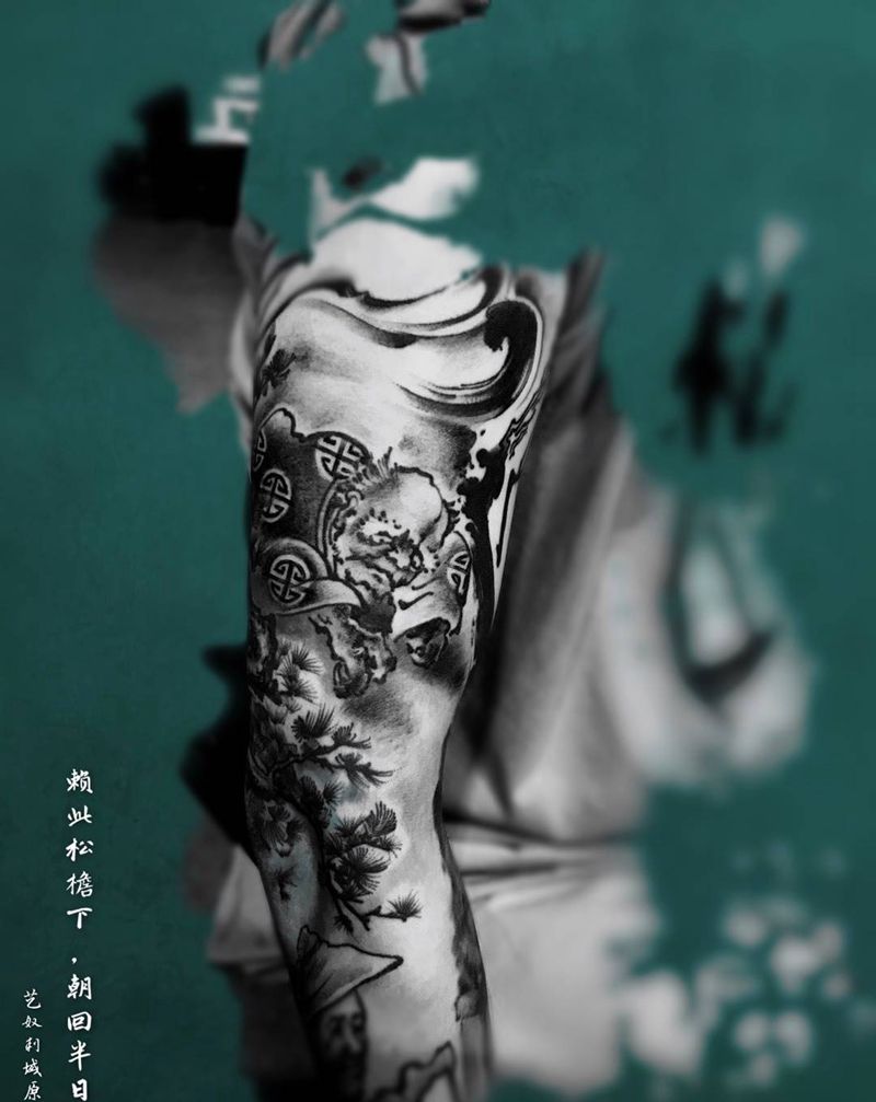 当前位置: 首页 >陕西省西安市纹身店-艺奴刺域纹身图案>原創中國風花臂纹身图片_手臂水墨中國風艺奴刺域纹身图案