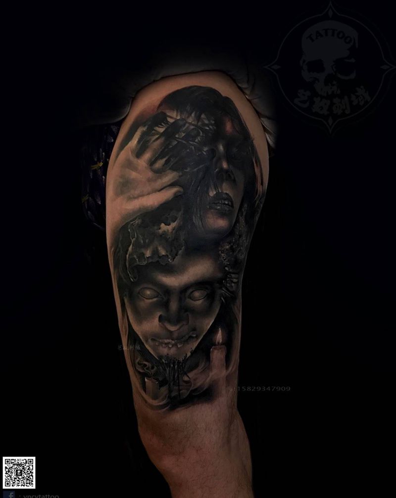 当前位置: 首页 >陕西省西安市纹身店-艺奴刺域纹身图案>和尚老师原创暗黑大腿纹身图片_腿部欧美写实暗黑原创纹身图案