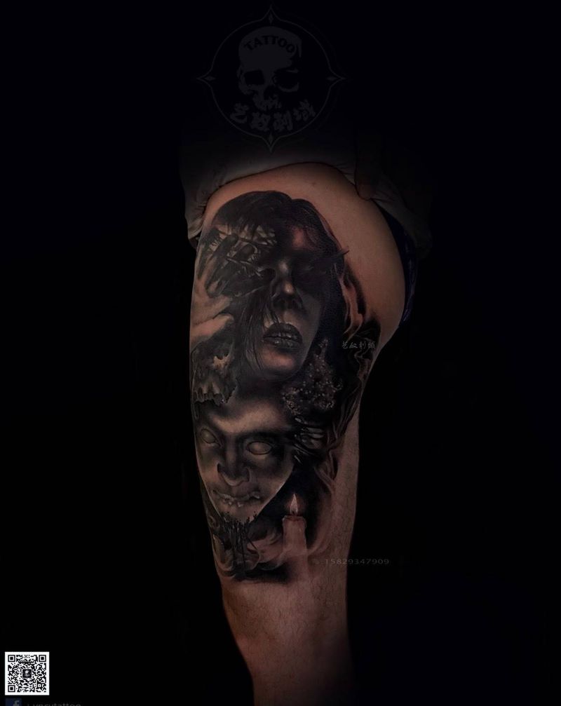 和尚老师原创暗黑大腿纹身图片_腿部欧美写实暗黑原创纹身图案
