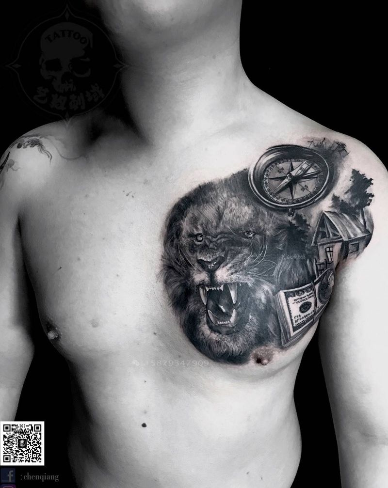 狮子指南针美金纹身图片_胸部欧美写实纹身图案