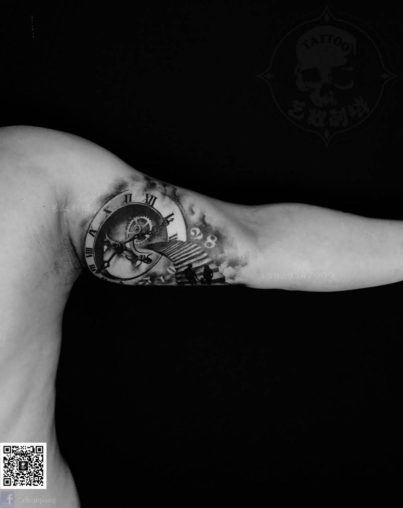 大臂纹身纹身图片_手臂欧美写实钟表艺奴刺域纹身图案