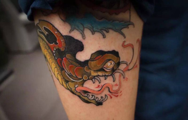 • T网红王老大花腿龙纹身图片_腿部新传统纹身图案