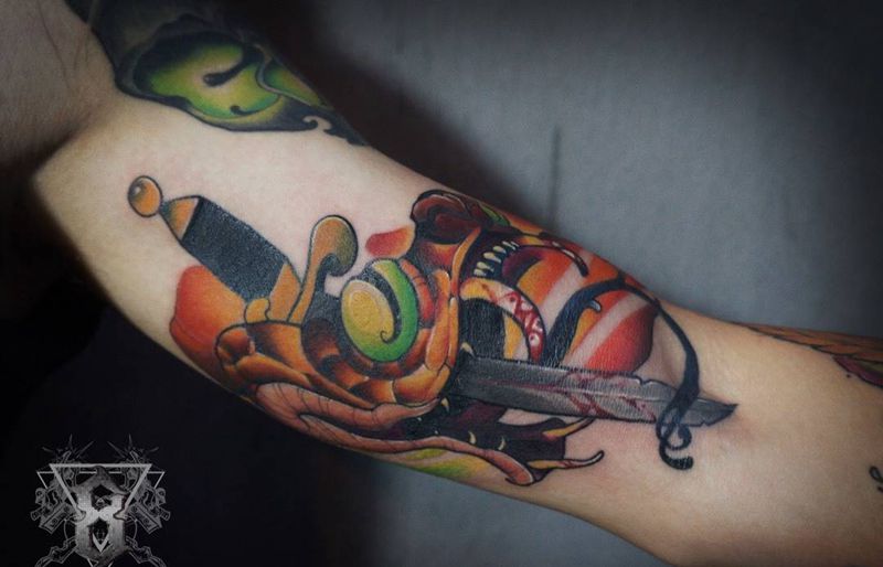 当前位置: 首页 >陕西省西安市纹身店-捌位TATTOO 纹身图案>蛇纹身图片_手部手臂New School蛇匕首纹身图案