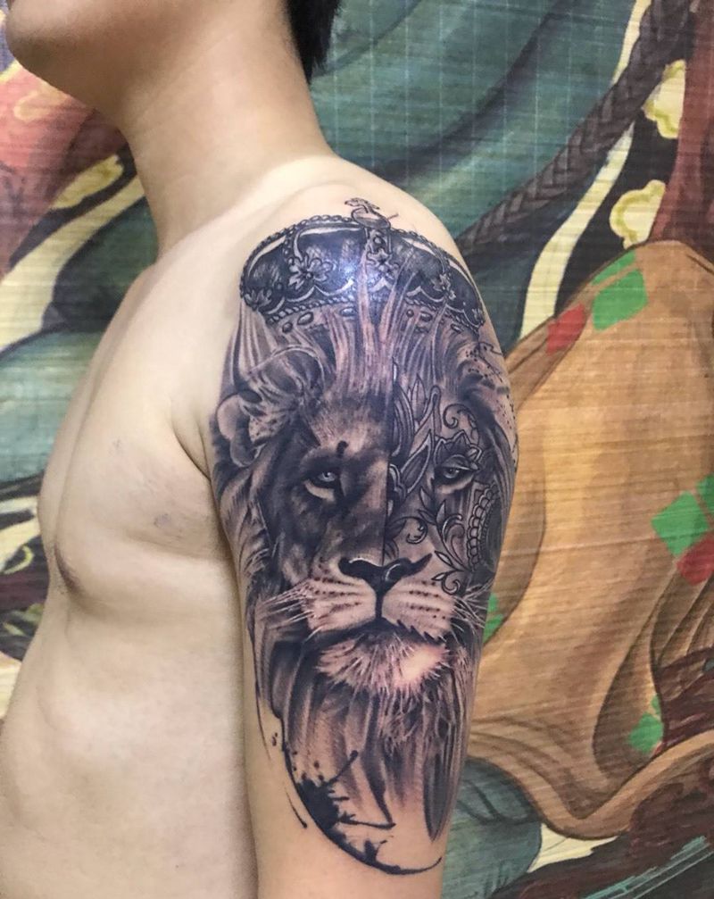 混搭狮子纹身图片_成品肩部欧美几何写实西安动物纹身图案
