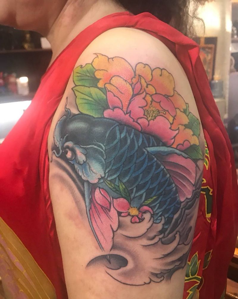 当前位置: 首页 >陕西省西安市纹身店-天瞳刺青处纹身图案>遮盖鱼结束.纹身图片_成品肩部传统动物西安纹身图案
