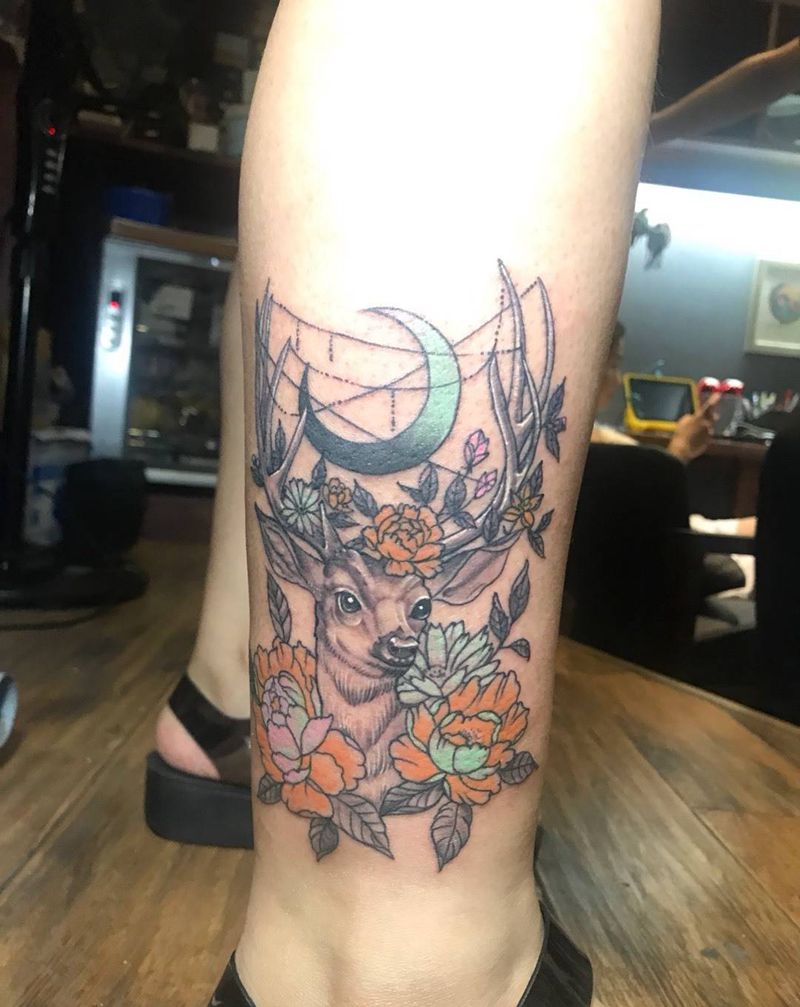 小麋鹿纹身图片_成品腿部欧美动物西安纹身图案