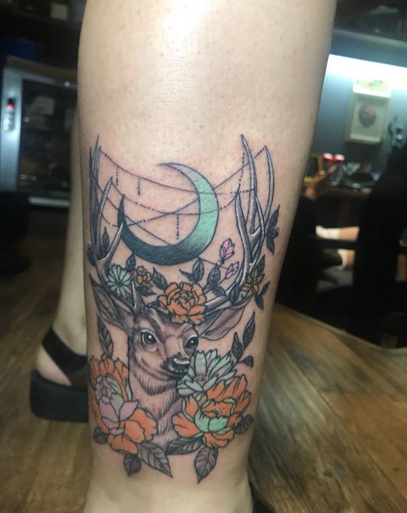 小麋鹿纹身图片_成品腿部欧美动物西安纹身图案