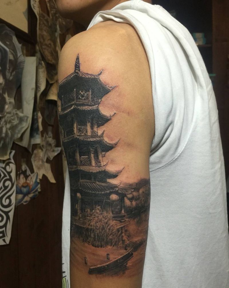 宝塔镇河妖……纹身图片_肩部欧美写实原创纹身图案