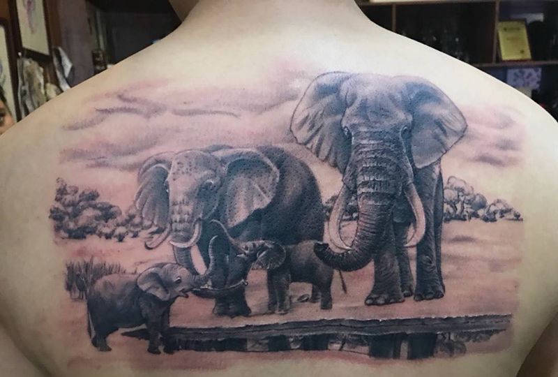 当前位置: 首页 >陕西省西安市纹身店-天瞳刺青处纹身图案>大象的一家纹身图片
