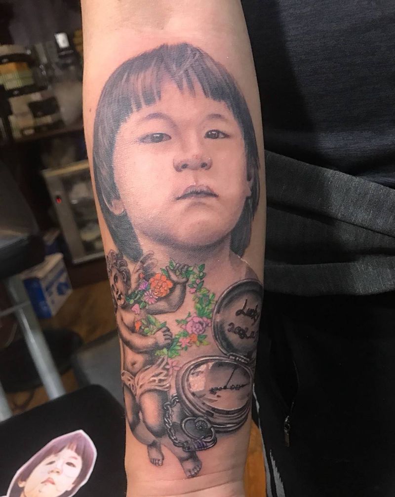 肖像天使纹身图片_成品手臂欧美肖像人物纹身图案