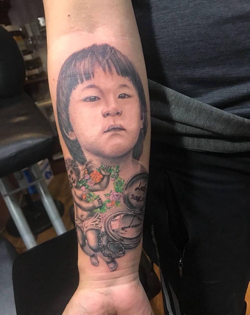 当前位置: 首页 >陕西省西安市纹身店-天瞳刺青处纹身图案>肖像天使纹身图片_成品手臂欧美肖像人物纹身图案