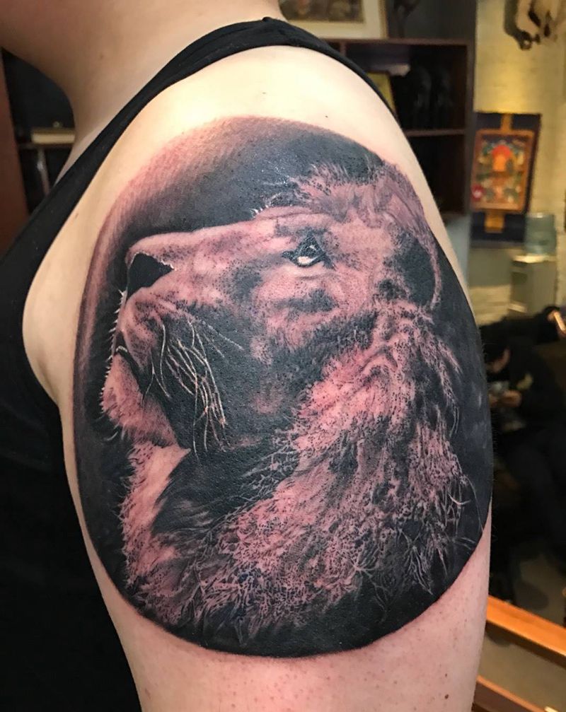 狮子纹身图片_成品肩部欧美写实动物西安纹身图案