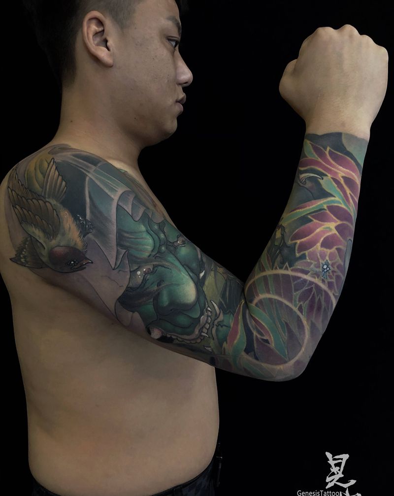 当前位置: 首页 >陕西省西安市纹身店-見山刺青処纹身图案>般若纹身图片_手臂新传统般若菊花花臂纹身图案