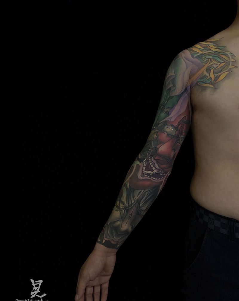 当前位置: 首页 >陕西省西安市纹身店-見山刺青処纹身图案>般若纹身图片_手臂新传统般若菊花花臂纹身图案