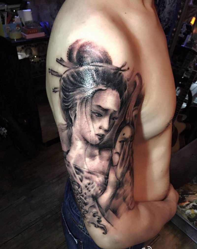 当前位置: 首页 >陕西省西安市纹身店-纹墨轩纹身纹身图案>艺妓纹墨轩素描纹图纹身图片_手稿手部肩部手臂传统写实肖像人物鬼神纹身图案