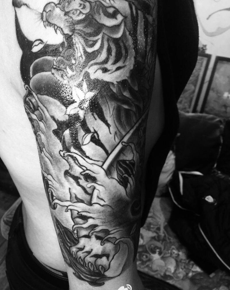 • T网红王老大花腿龙纹身图片_腿部新传统纹身图案