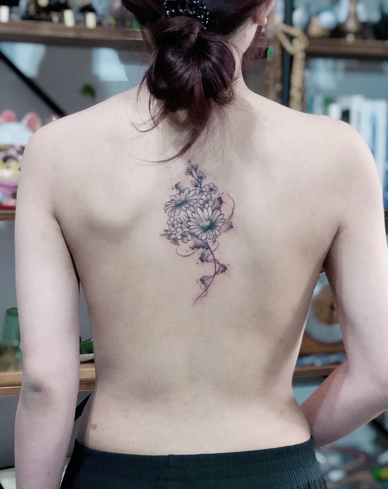 雏菊纹身图片_背部点刺水墨纹身图案