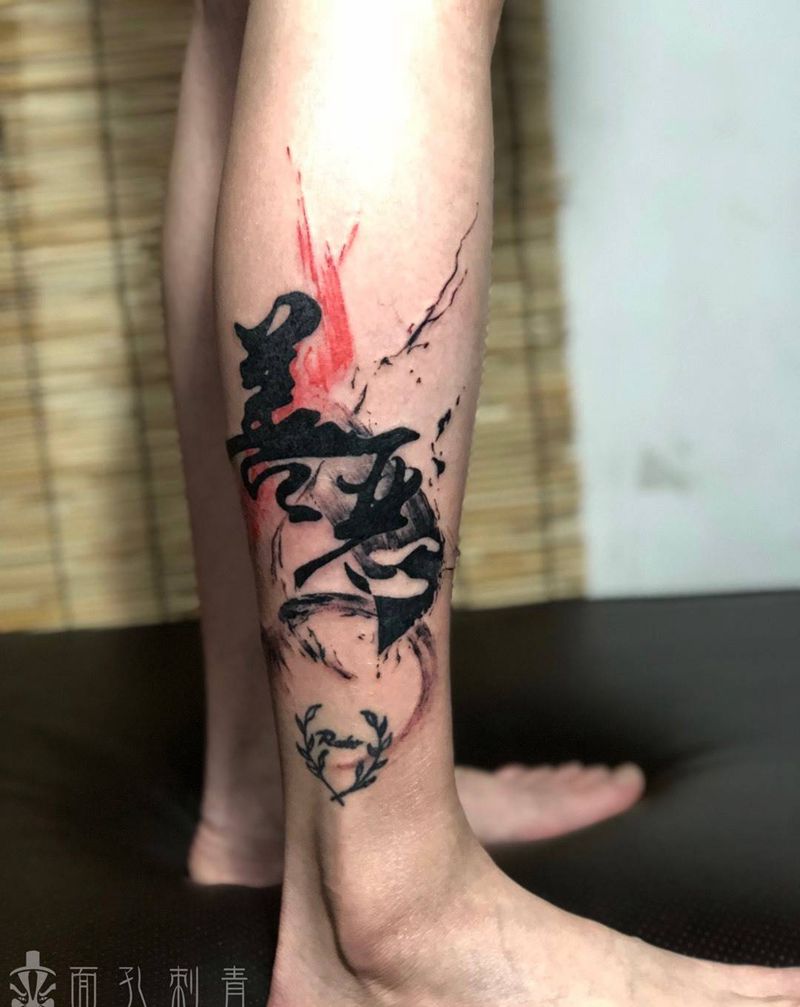 文字设计纹身图片_腿部水墨老传统纹身图案