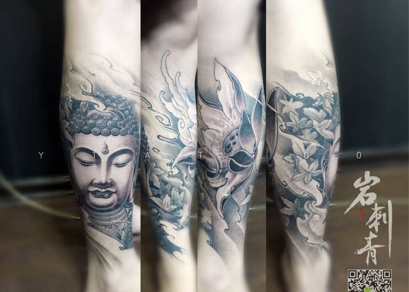 佛头莲花包小腿纹身图片_成品腿部传统人物植物纹身图案