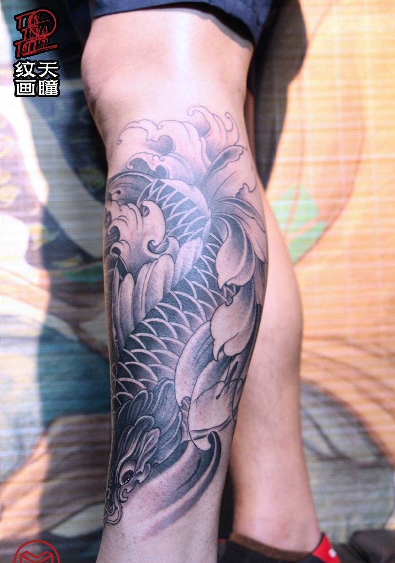 荷花锦鲤纹身图片_腿部新传统纹身图案