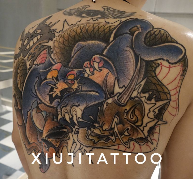 大乱斗纹身图片_背部New School猫狗龙纹身图案