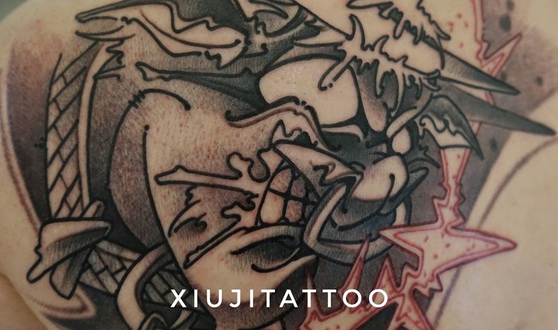 new school 牛 未完纹身图片_肩部背部New School纹身图案