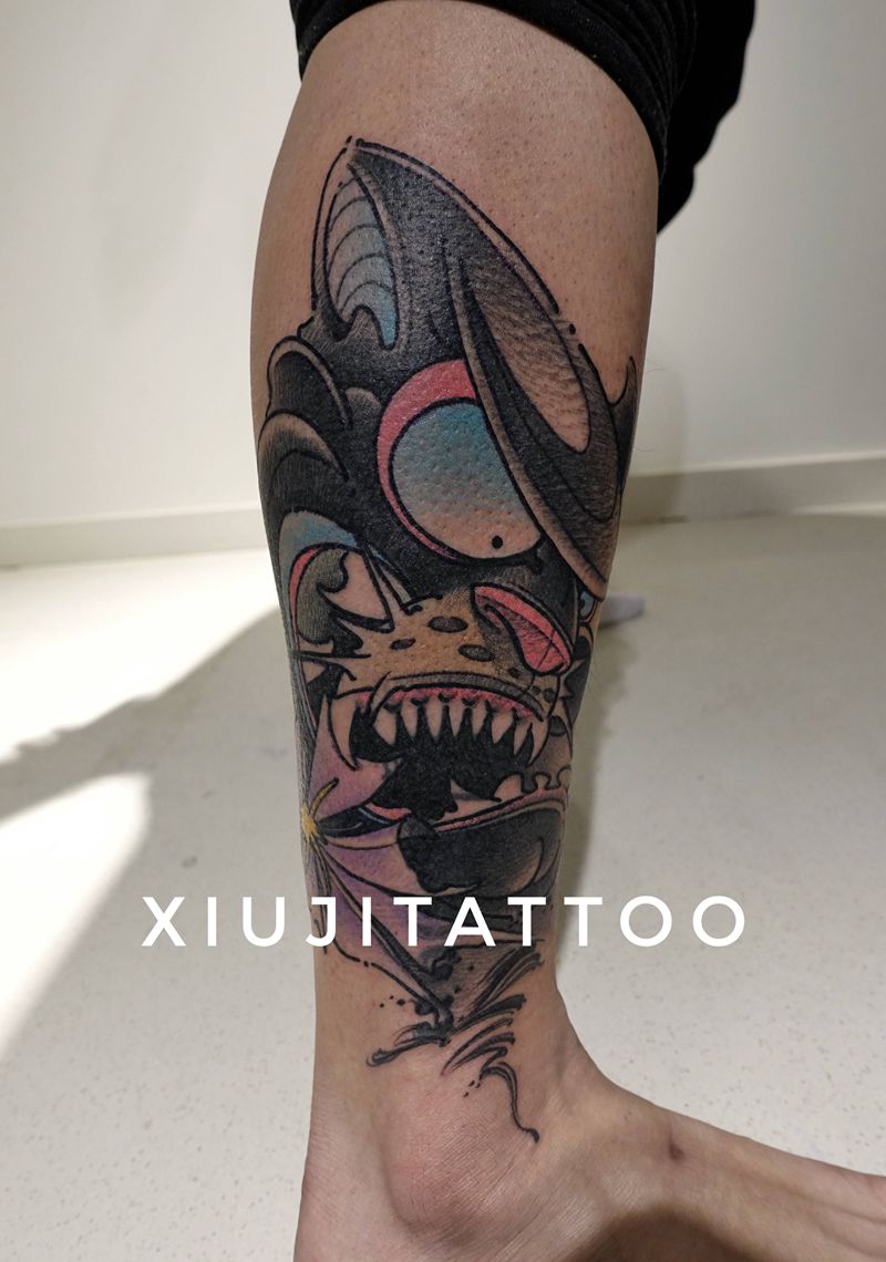 • T网红王老大花腿龙纹身图片_腿部新传统纹身图案
