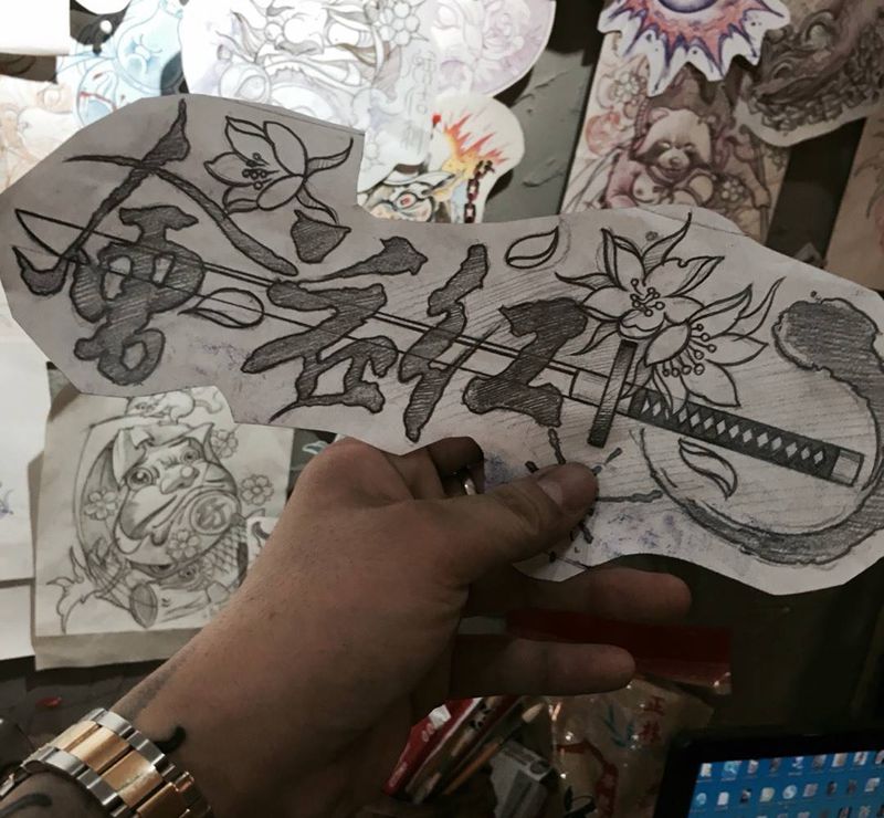 当前位置: 首页 >陕西省西安市纹身店-绣佶刺青纹身图案>字体纹身图片_成品手稿手臂传统国画字符原创纹身图案