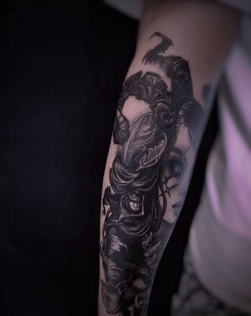 当前位置: 首页 >陕西省西安市纹身店-叁目乌TATTOO STUDIO纹身图案>Black work纹身图片_手臂欧美写实点刺纹身图案