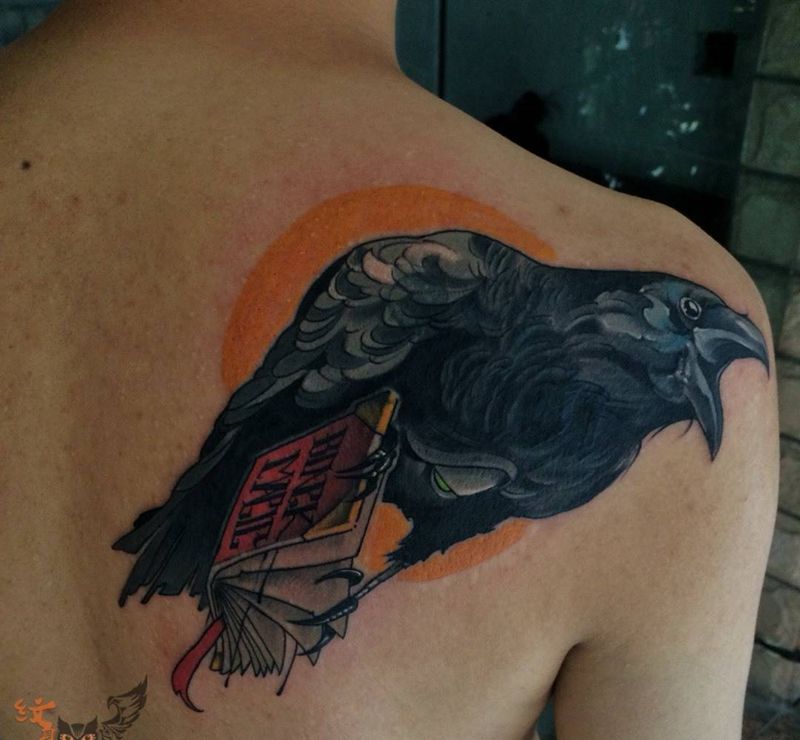 当前位置: 首页 >陕西省西安市纹身店-绣佶刺青纹身图案>乌鸦纹身图片_欧美宗教鬼神动物肩部纹身图案
