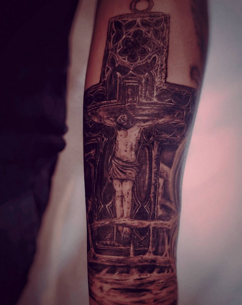 当前位置: 首页 >陕西省西安市纹身店-叁目乌TATTOO STUDIO纹身图案>十字架纹身图片_手臂欧美写实纹身图案
