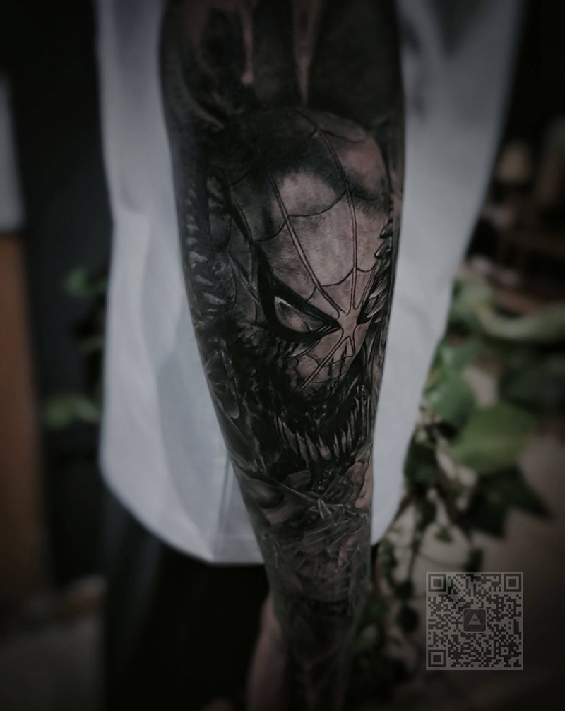 当前位置: 首页 >陕西省西安市纹身店-叁目乌TATTOO STUDIO纹身图案>毒液纹身图片_手臂手部欧美写实纹身图案