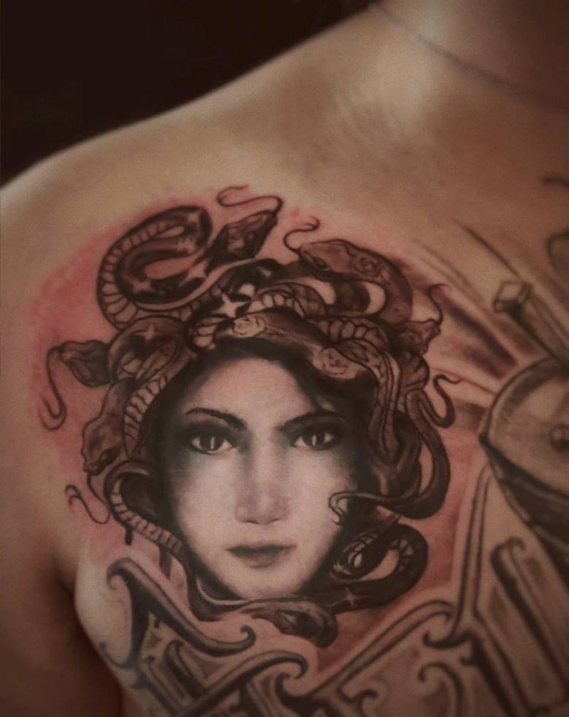 肖像改美杜莎纹身图片_胸部欧美写实花体字纹身图案