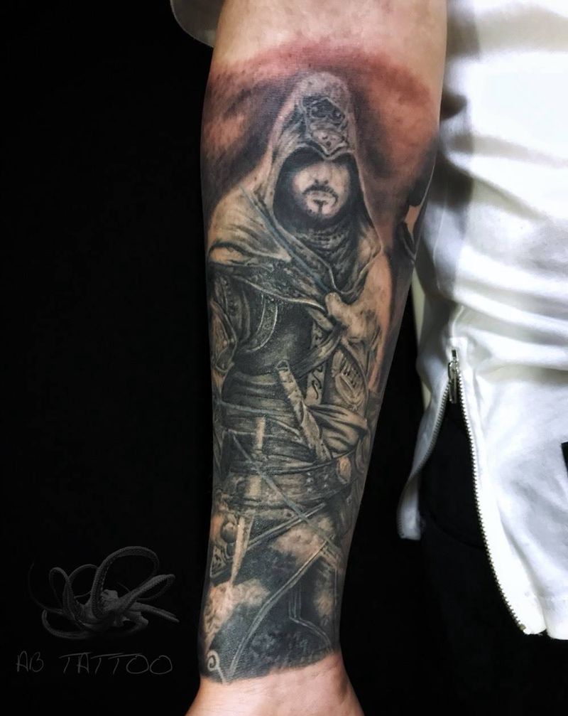 当前位置: 首页 >陕西省西安市纹身店-叁目乌TATTOO STUDIO纹身图案>刺客信条主题包臂纹身图片