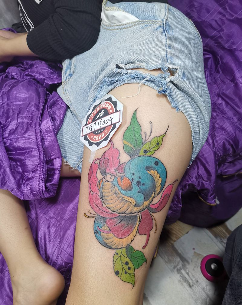 当前位置: 首页 >陕西省西安市纹身店-悲闻刺青纹身图案>蛇纹身图片_腿部纹身图案