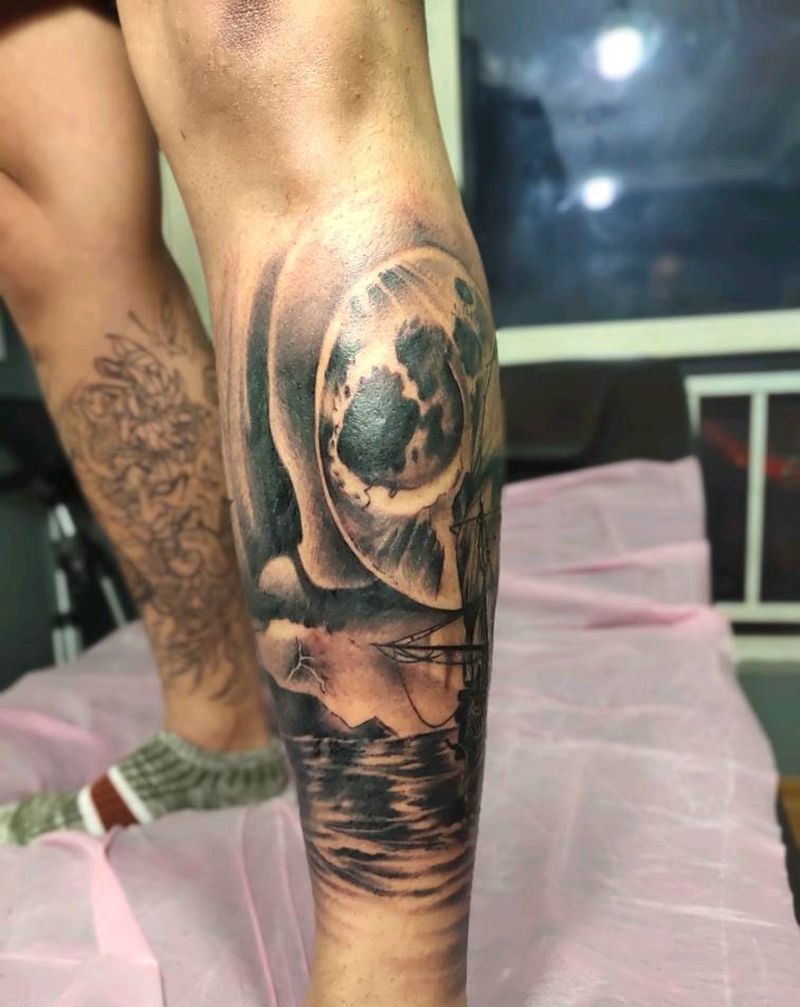 当前位置: 首页 >陕西省西安市纹身店-TATTOO HONE纹身工作室纹身图案>【帆船】纹身图片_腿部欧美写实纹身图案