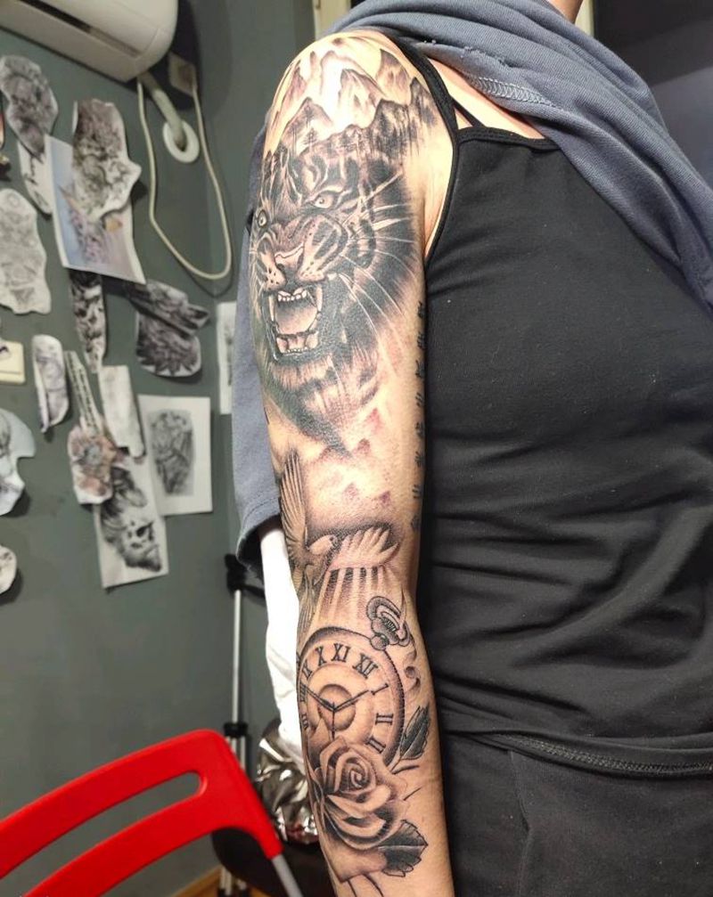 当前位置: 首页 >陕西省西安市纹身店-TATTOO HONE纹身工作室纹身图案>花臂纹身图片_手臂欧美写实纹身图案